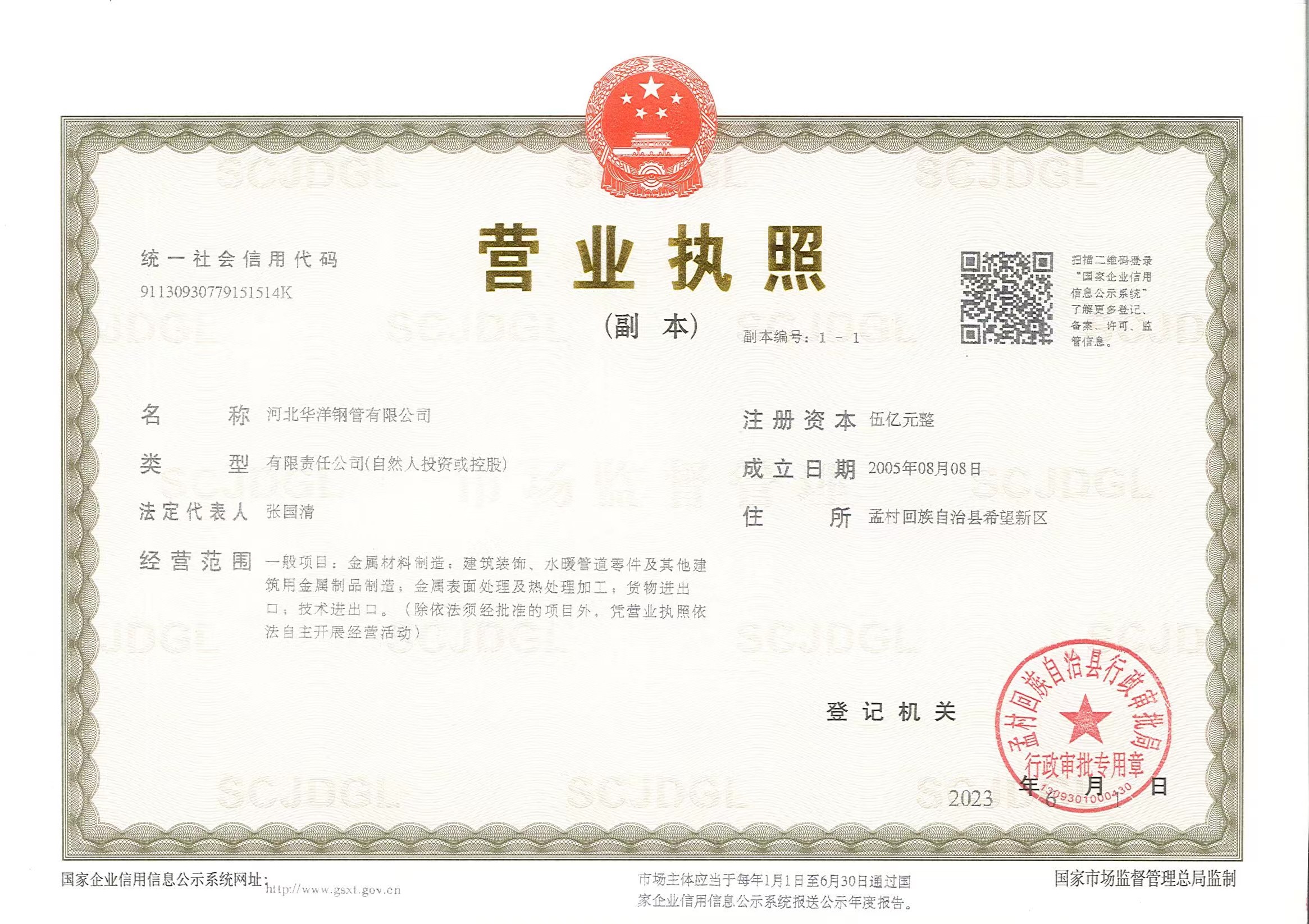 公司產品主要用于石油、天然氣、水、蒸汽、煤氣等高、中、低壓流體輸送管道及打樁、橋梁、建筑等結構用鋼管,并承擔了國內外標志性工程建設,華洋作為一個綜合型生產企業,下設河北銘高貿易有限公司,以及在天津石家莊、山東、四川、廣州等地設立有3家分公司和5個辦事處。產品銷往各個城市井出口東南亞、中東、歐美等八十多個地區,在國內外享有很高的聲譽。